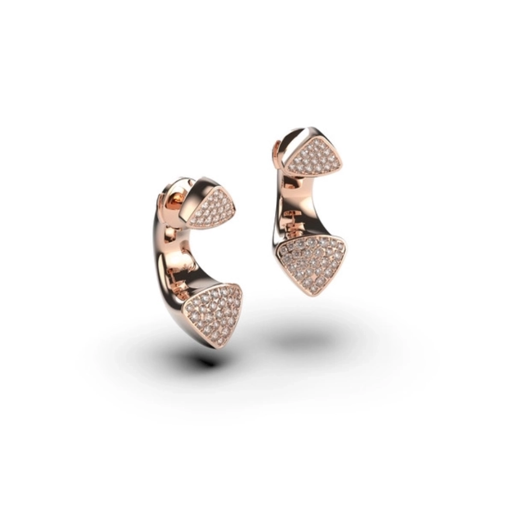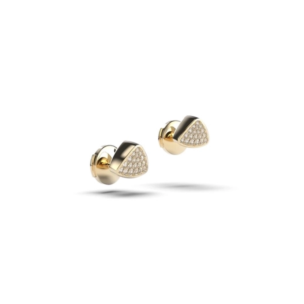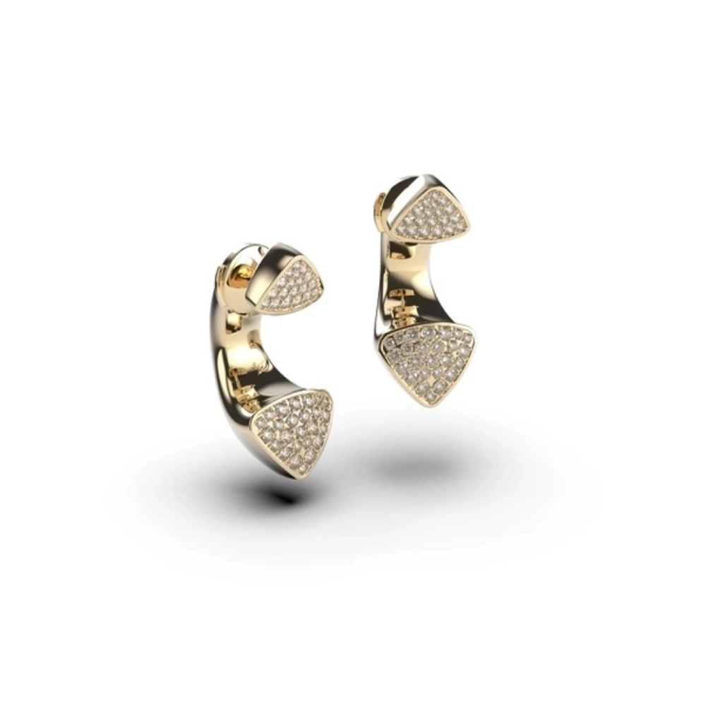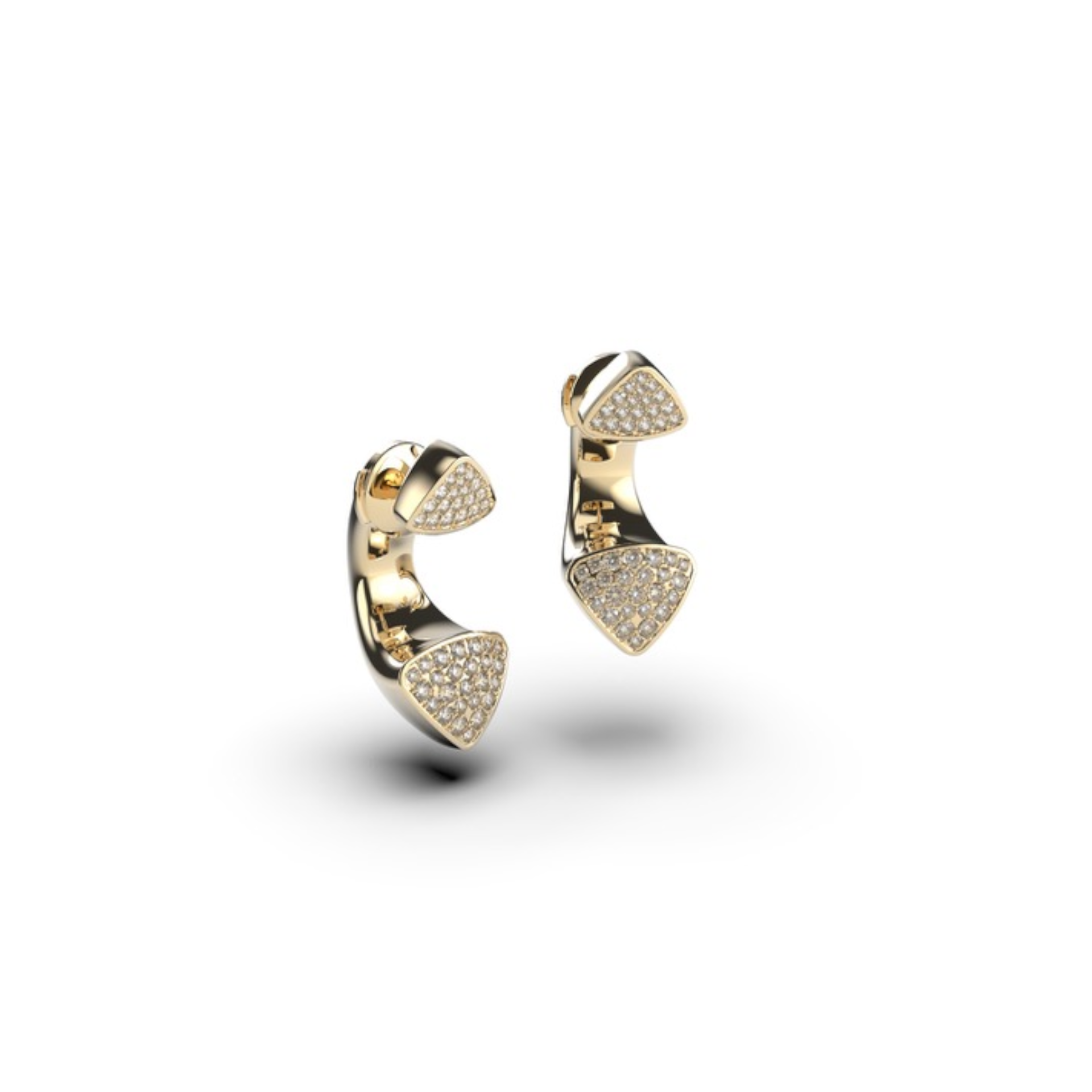 Ajour Duo earrings combine sculptural gold volumes with pavé-set diamonds. Designed as a versatile double earring, the upper element can be worn alone as a stud.