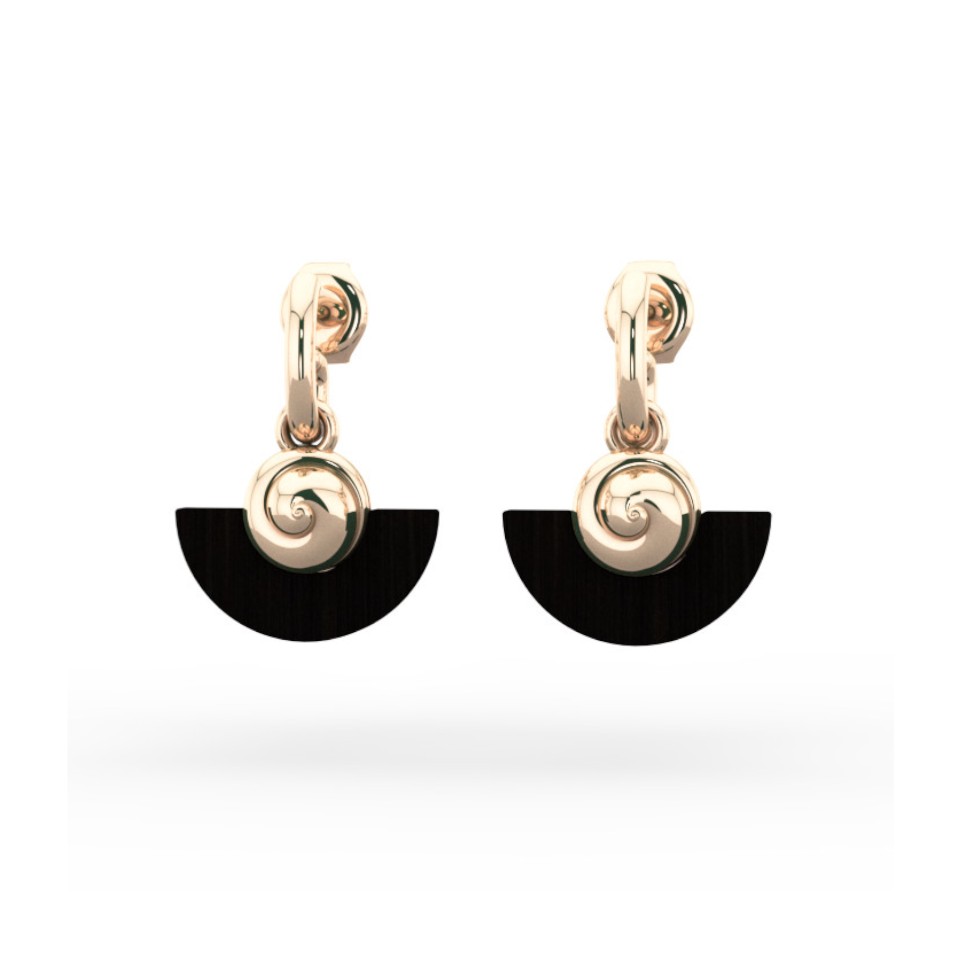 Earrings in gold and ebony wood, Gold and ebony wood pendant. This volute-shaped earrings features finely polished shells with a chiselled openwork back.