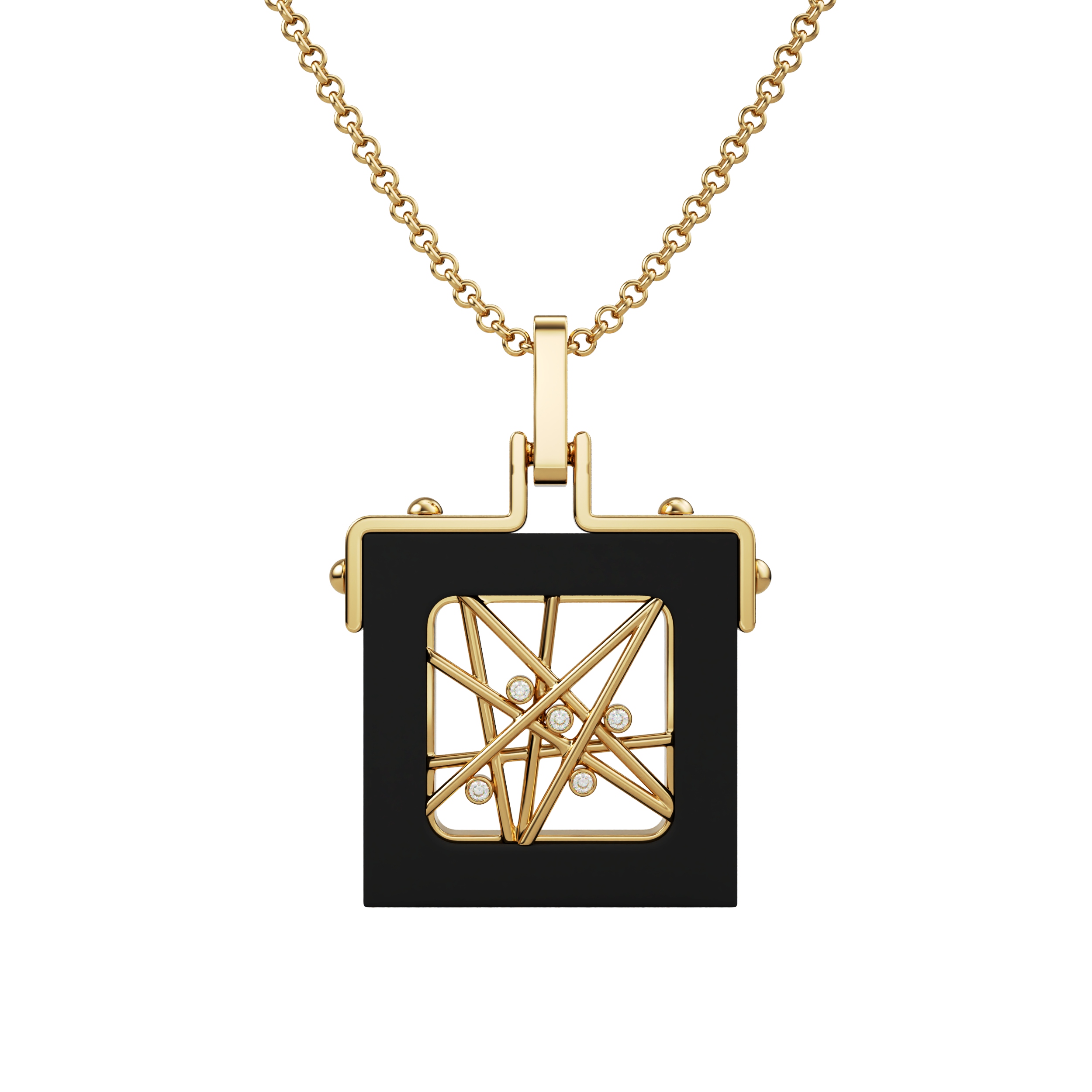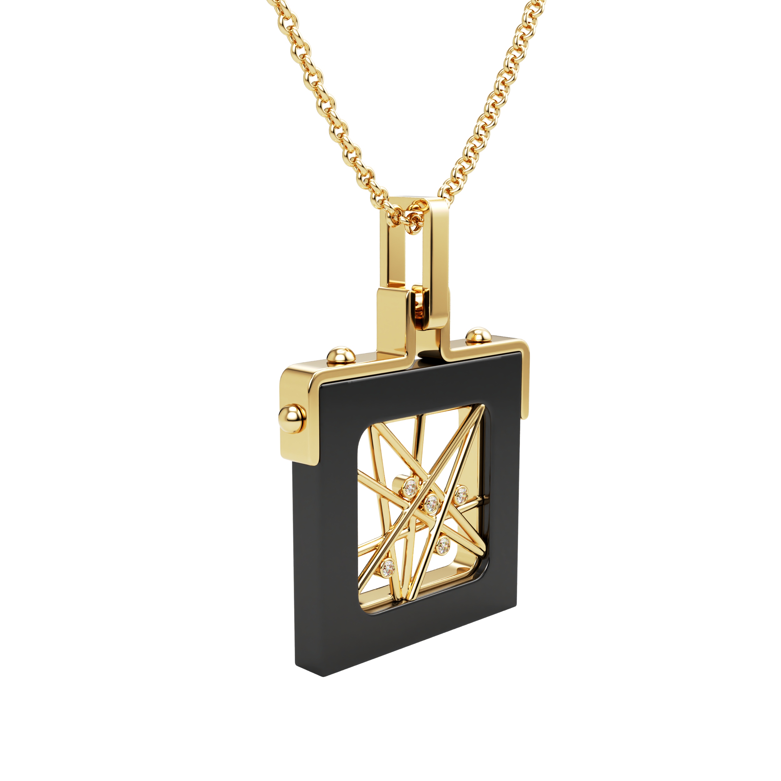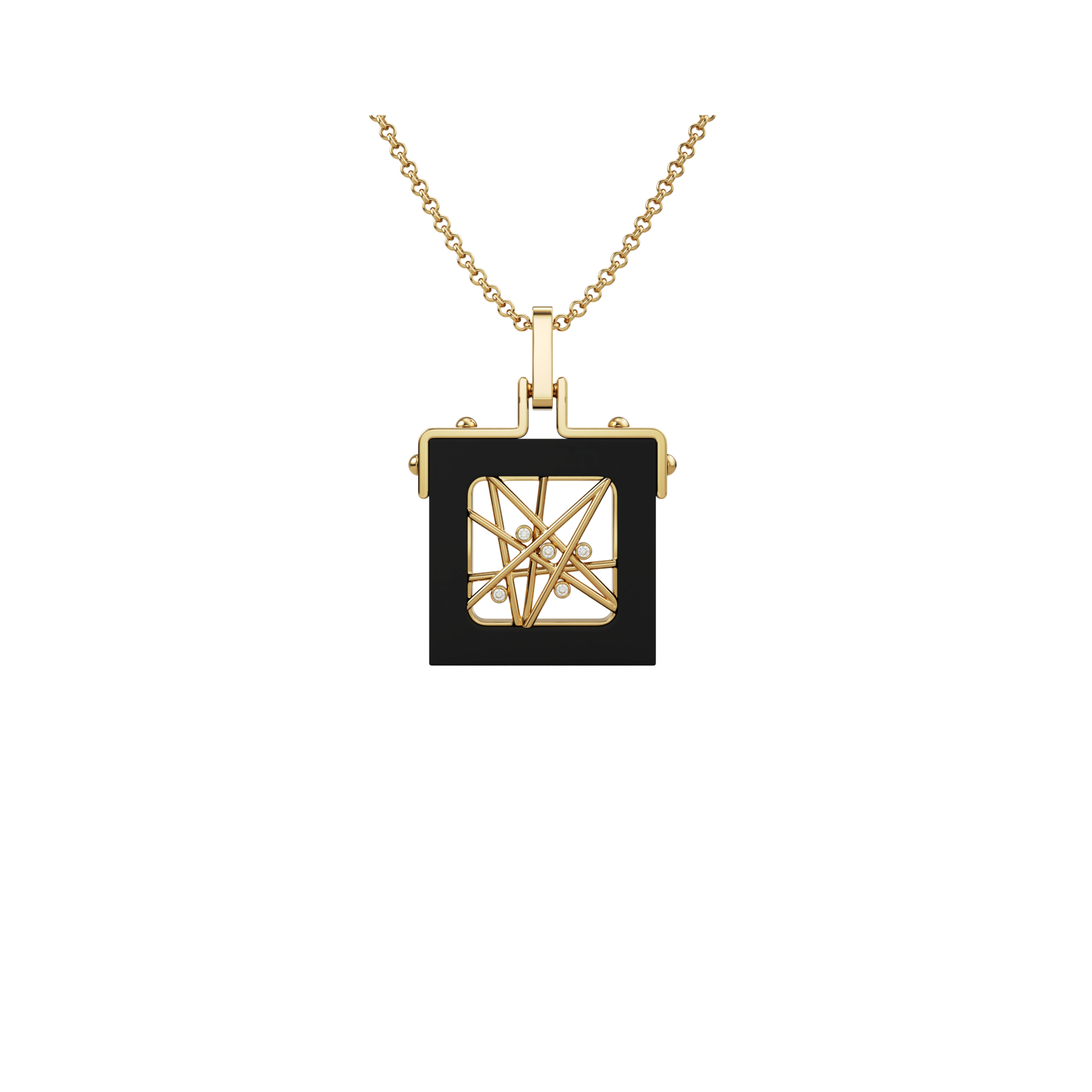 Pendant Toile Perlée pairs ebony wood with 18k gold in a graphic, architectural composition, highlighted by a discreet diamond pavé.