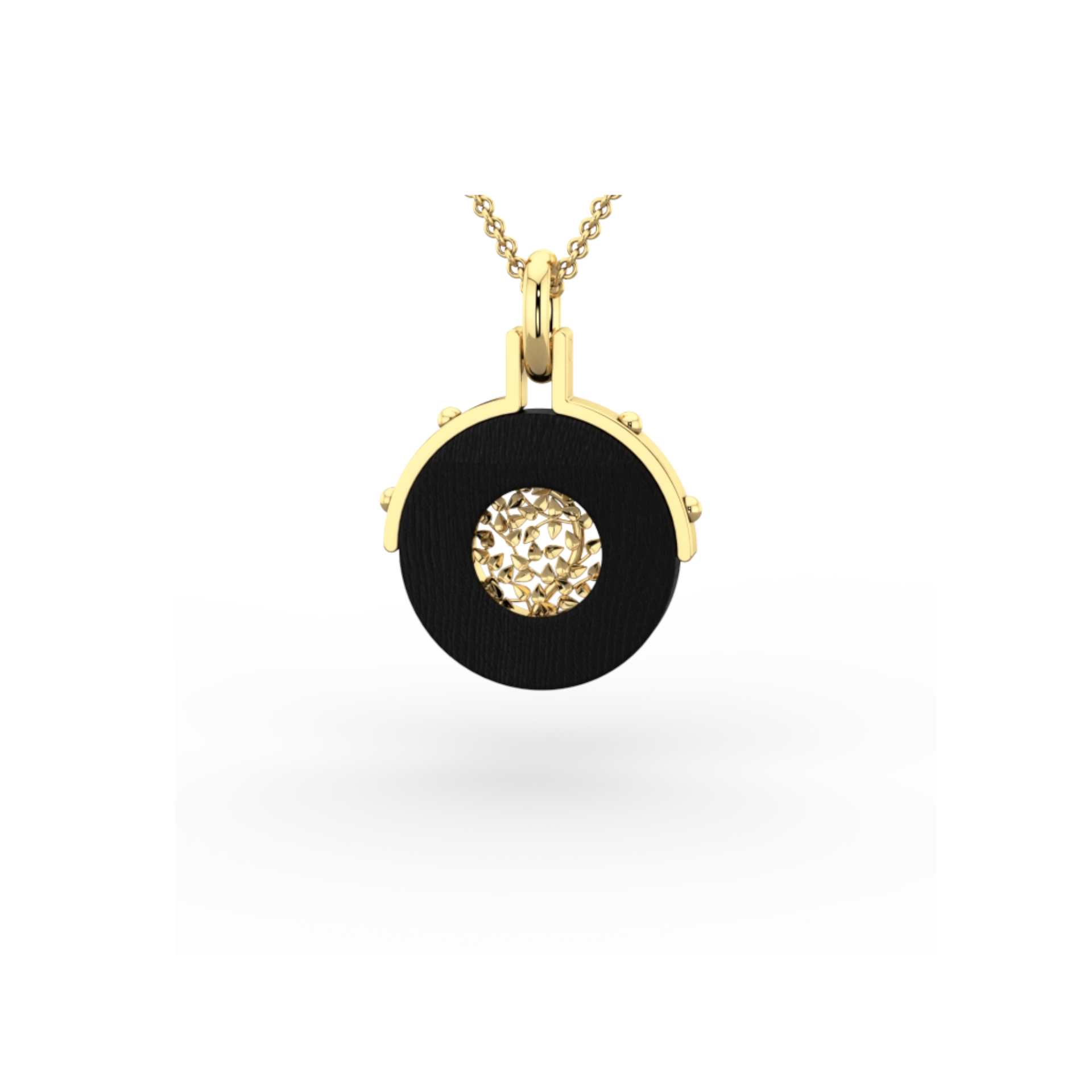 A sculptural pendant combining ebony wood and 18k gold, centred by an openwork foliage motif.