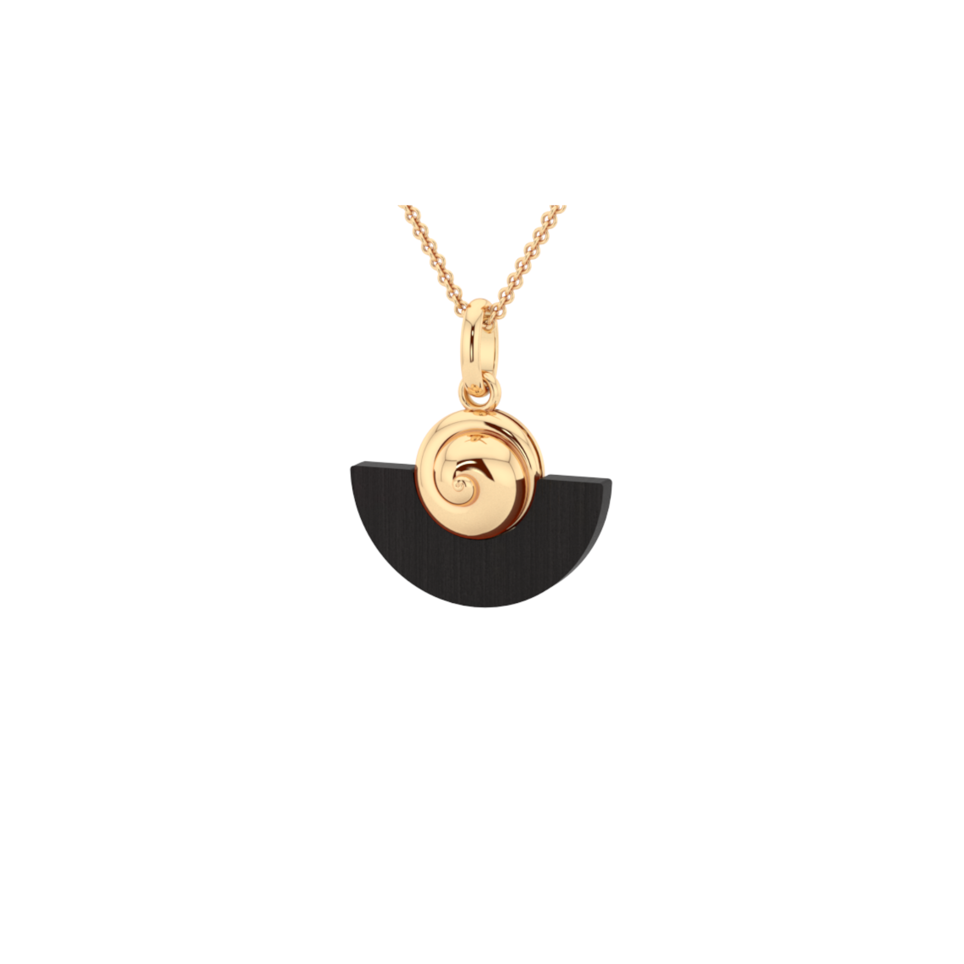 Pendant in gold and ebony wood. Gold and ebony wood pendant. This volute-shaped piece of jewellery features a finely polished shell with a chiselled openwork back.