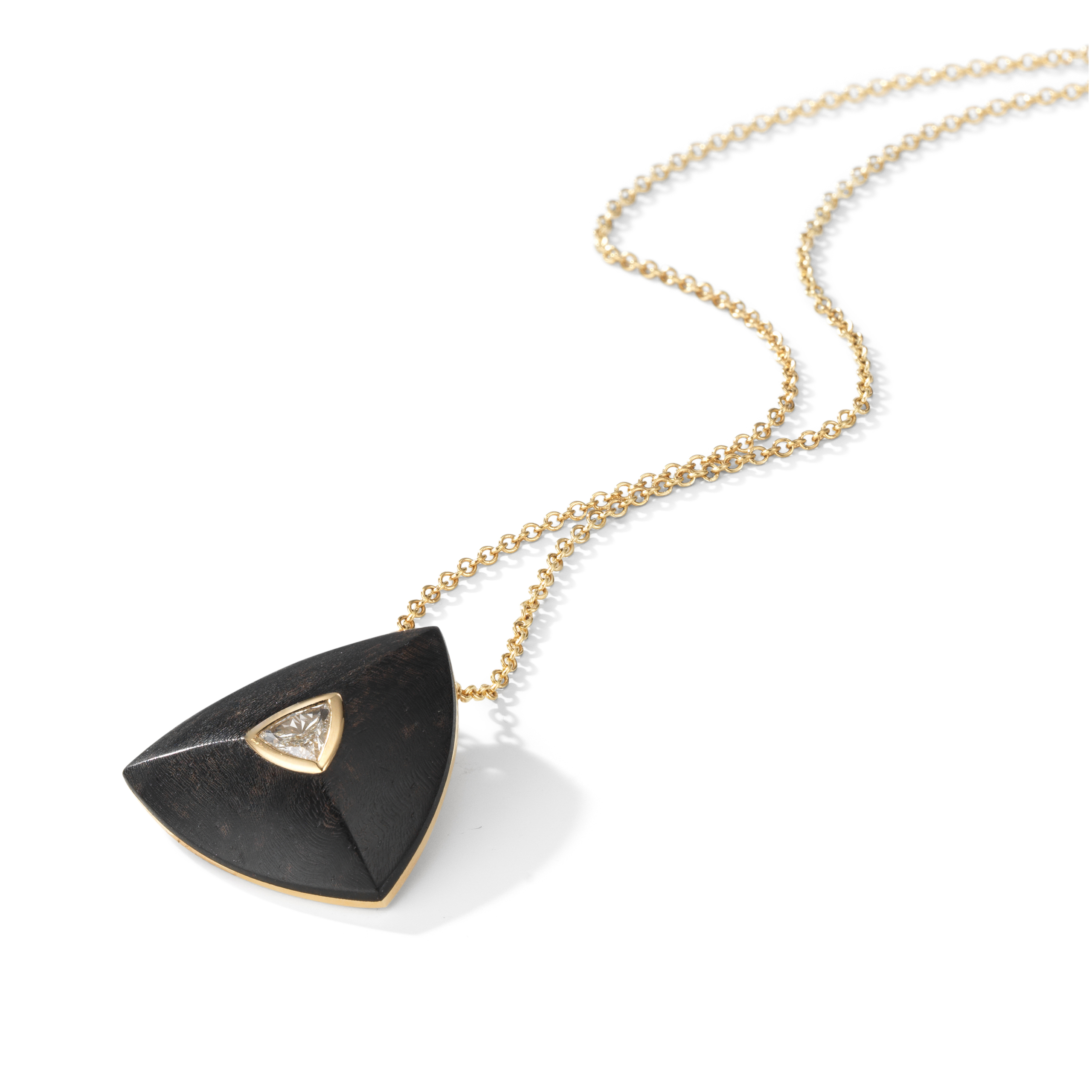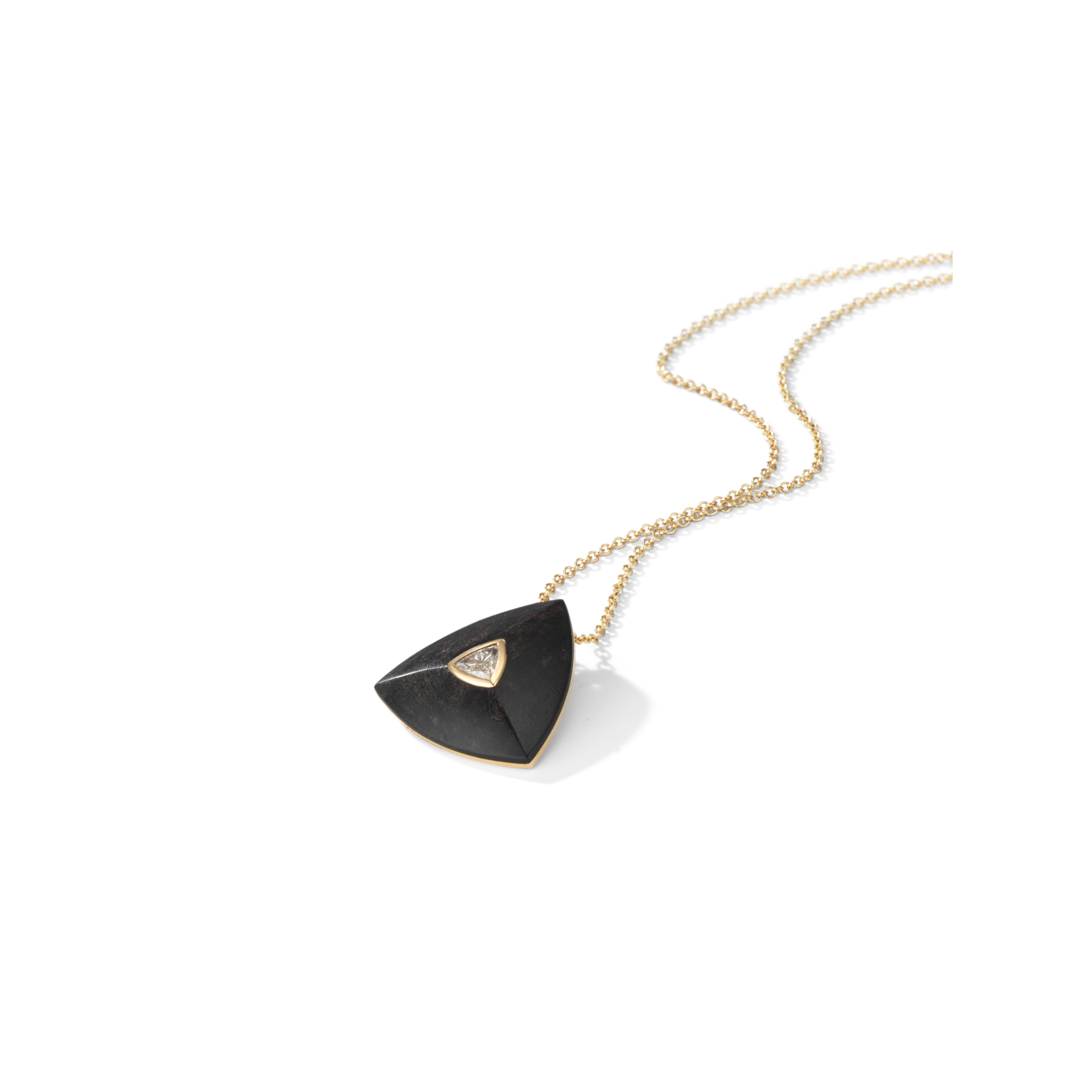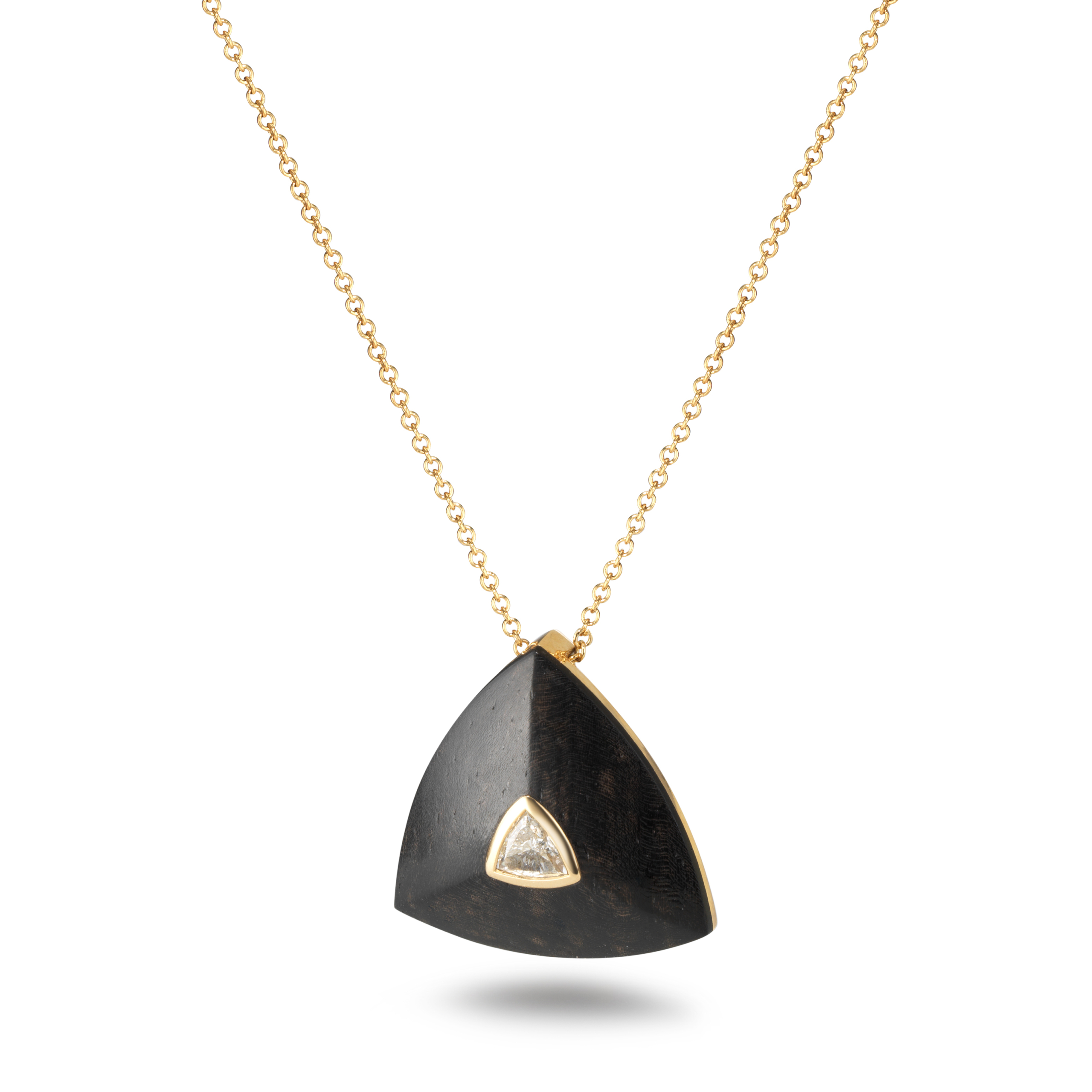 Trillion pendant in ebony wood and 18k gold, set with a single brilliant-cut diamond.