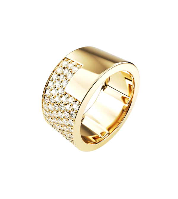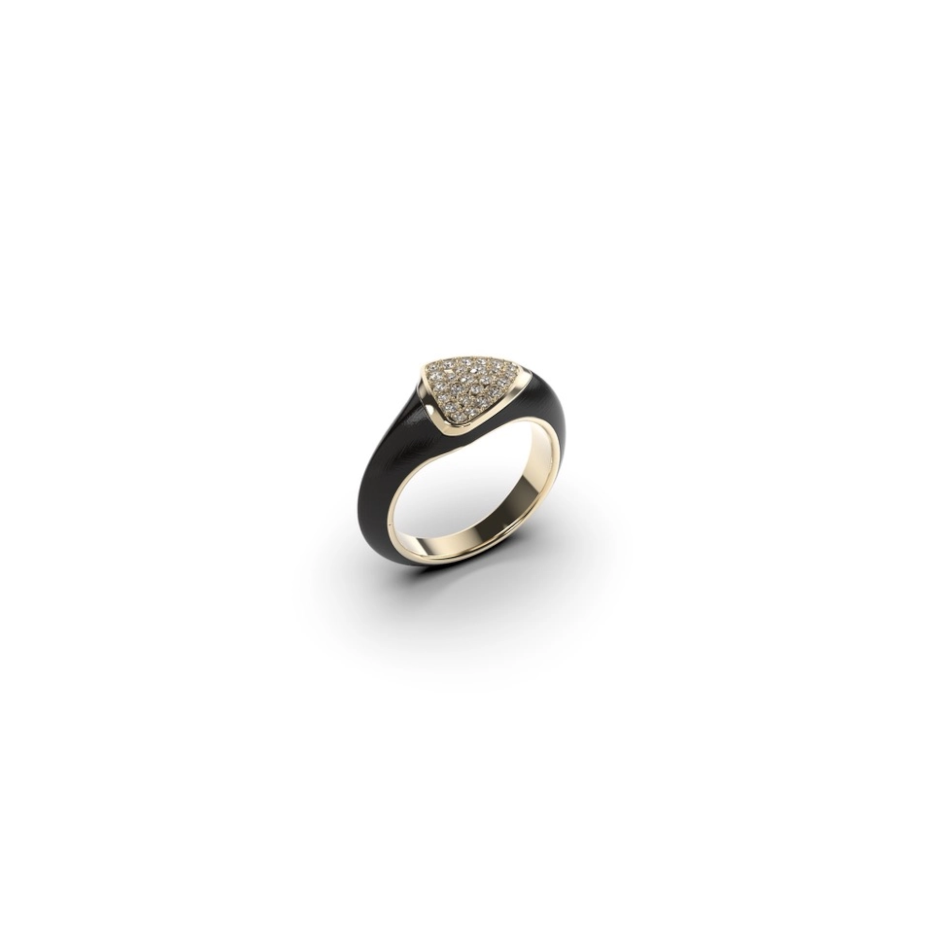 Ring in gold and ebony wood featuring a central triangle adorned with diamonds.
