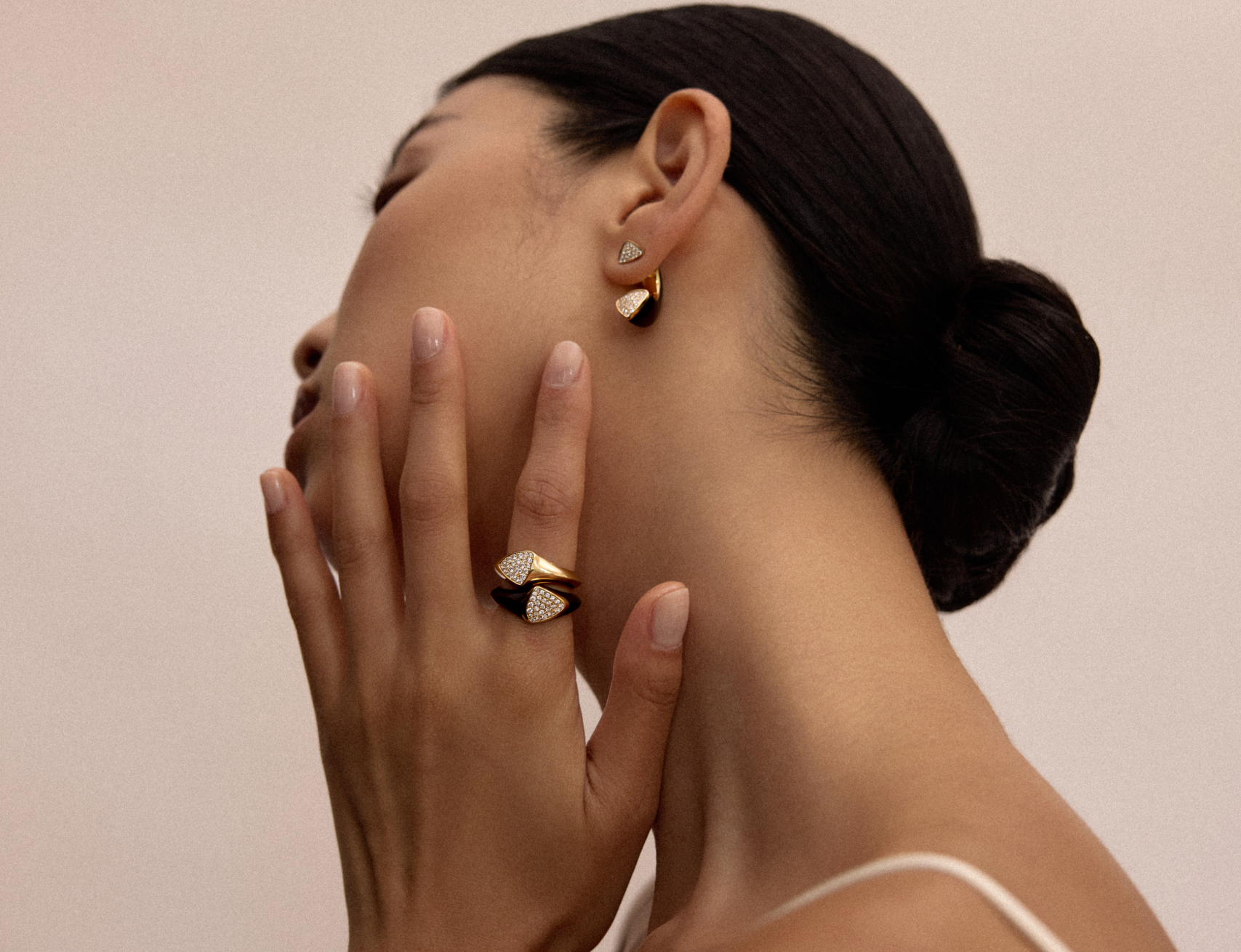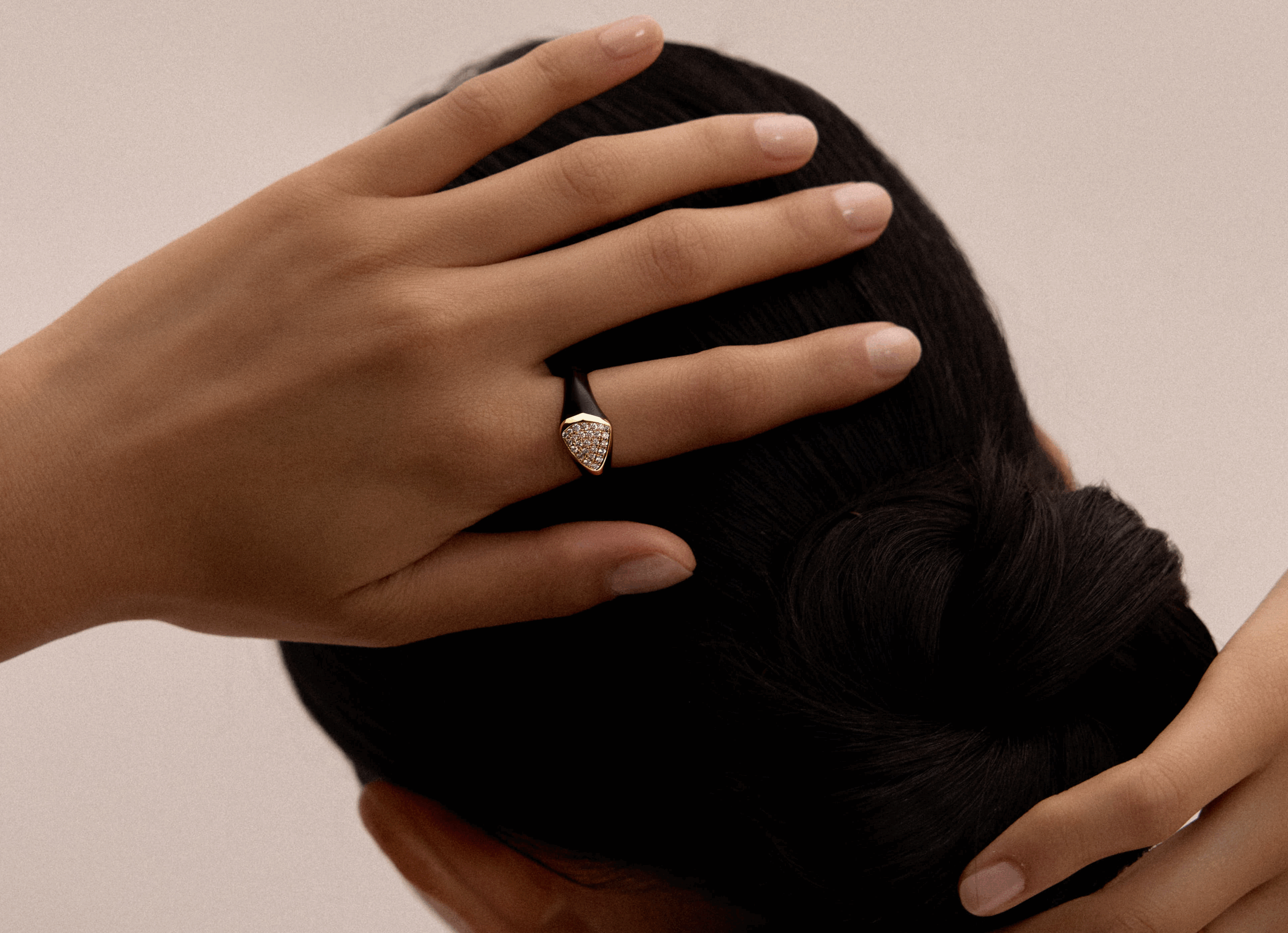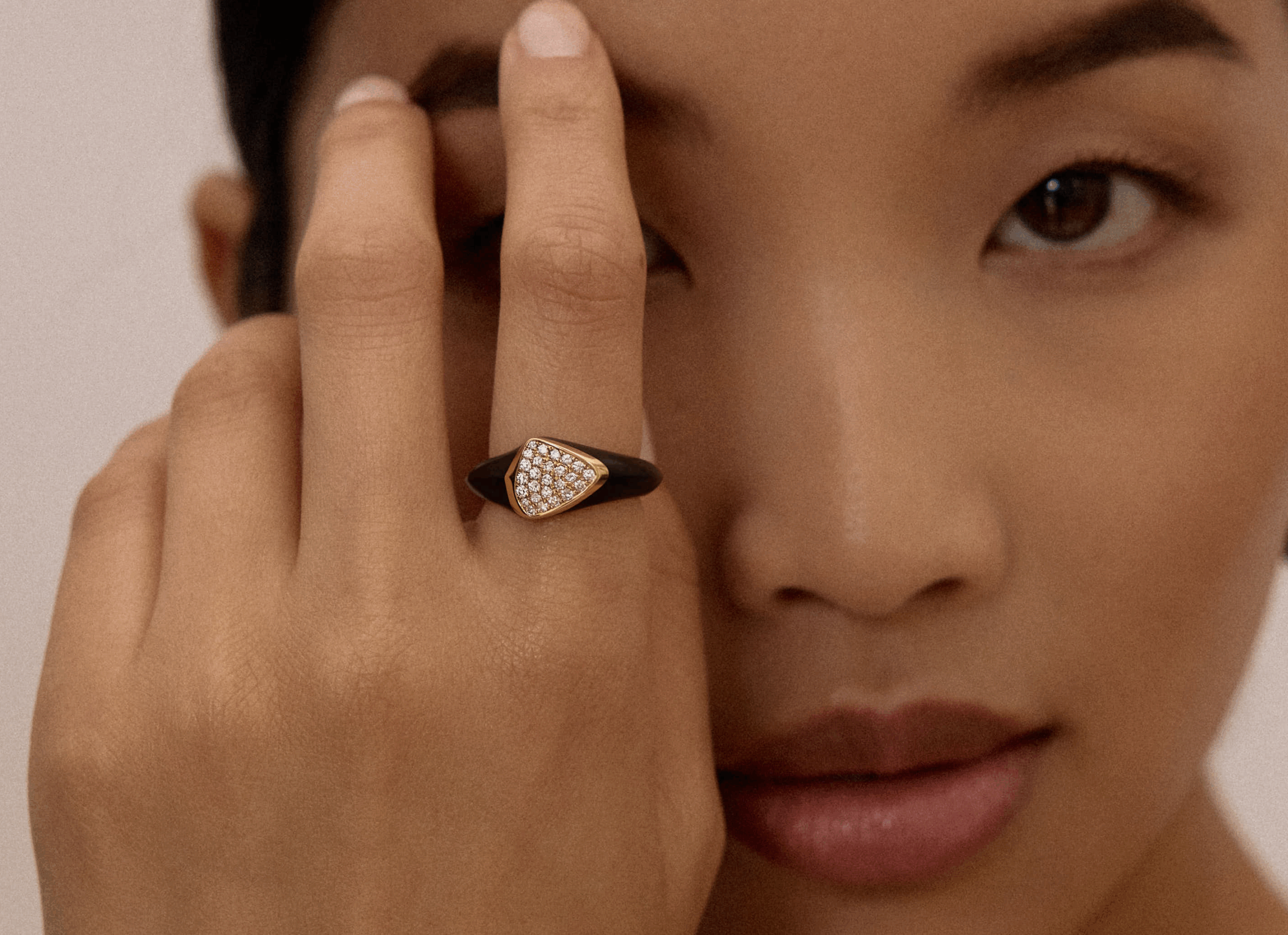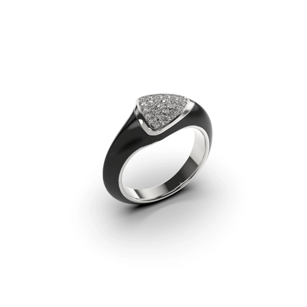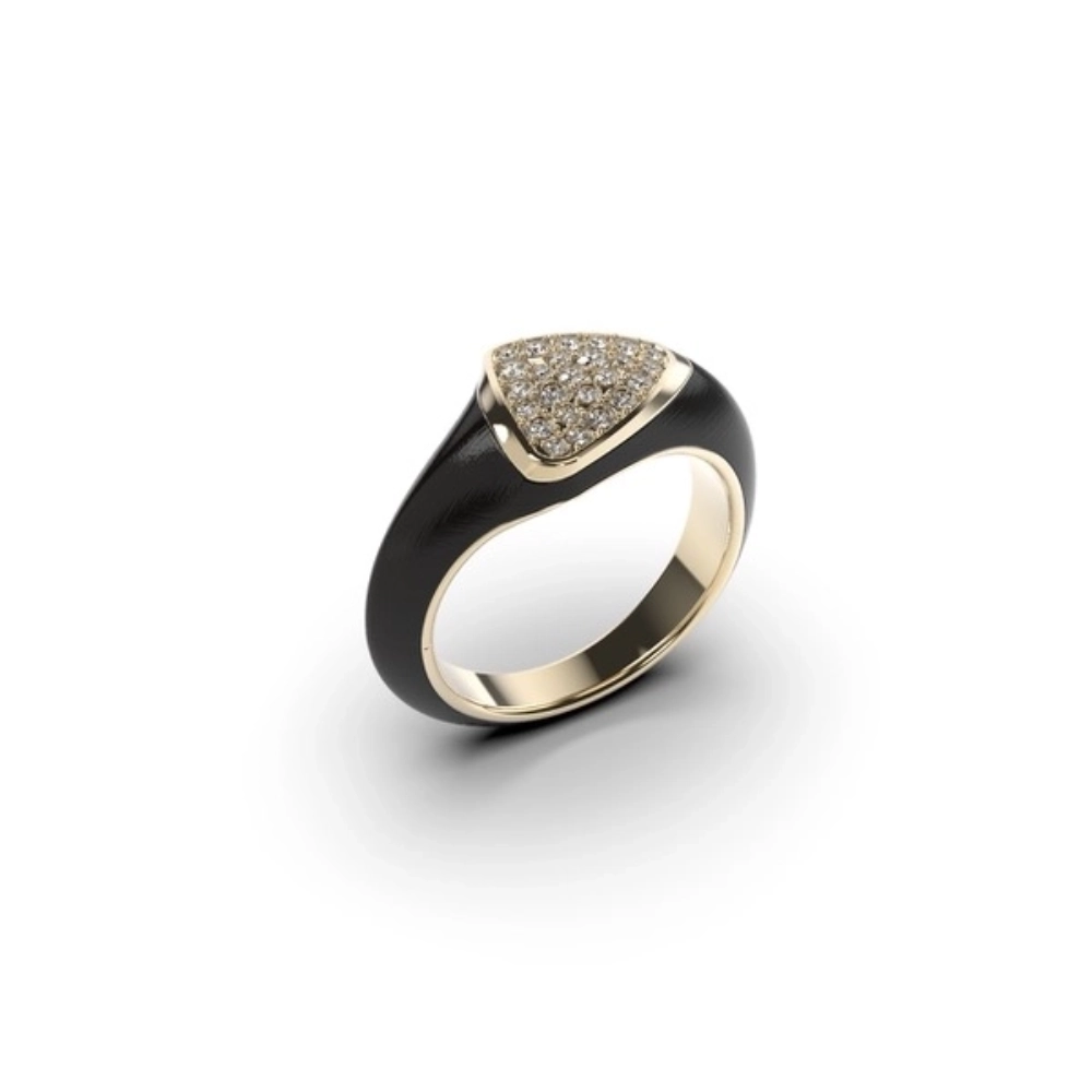 Ring Ajour Chevalière Eben combines ebony wood and 18k gold in a sculptural signet form, highlighted by a diamond-set triangular motif.