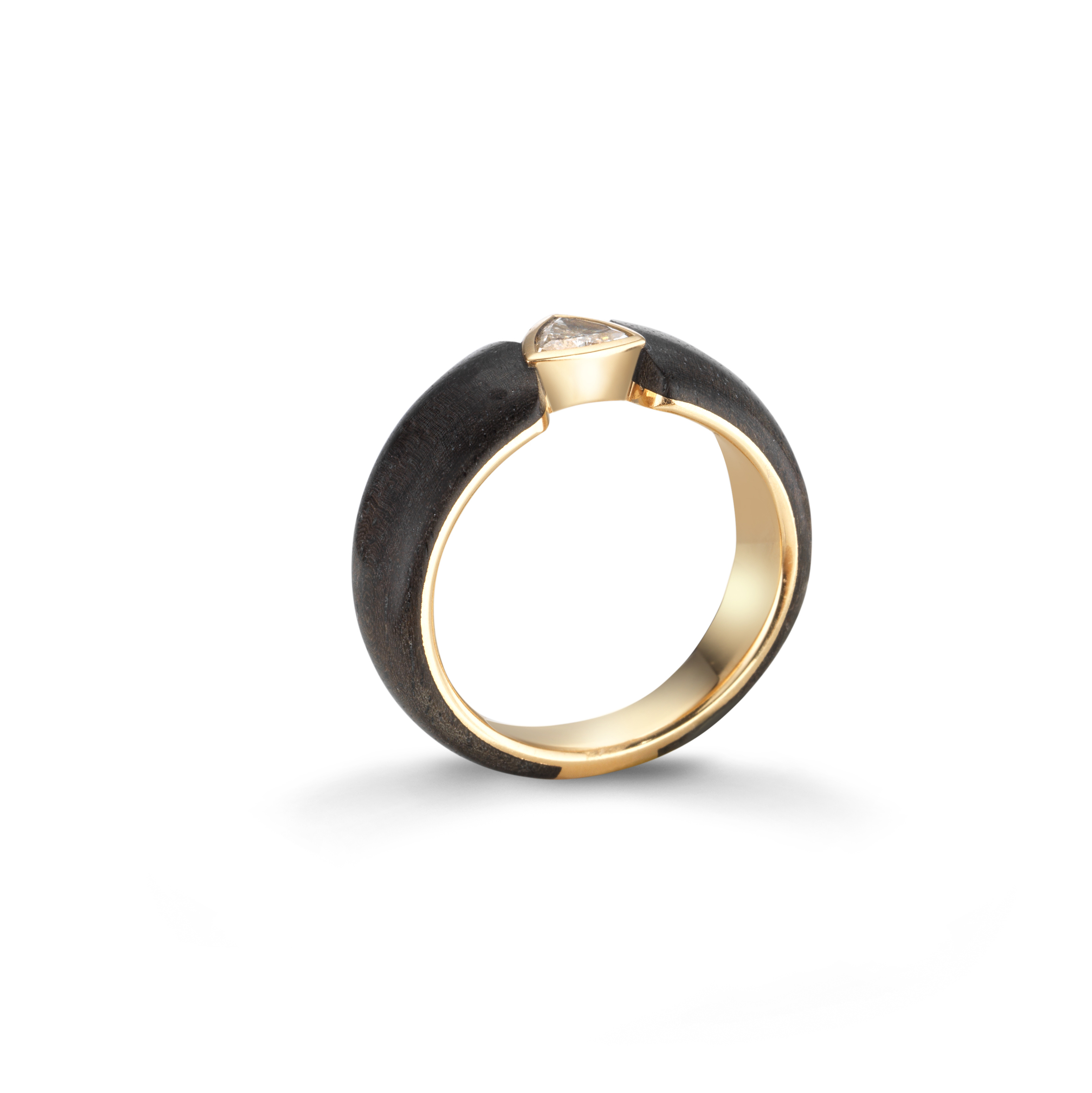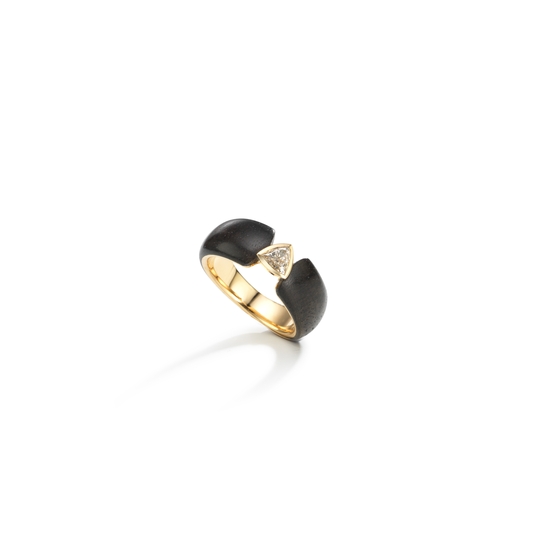 Ring Trillion pairs sculpted ebony wood with 18k gold, centred by a striking diamond.